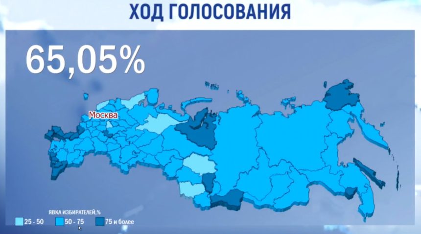 По данным Центральной избирательной комиссии к часу дня 17 марта по московскому времени на выборах президента России проголосовали 65% избирателей. Напомним , что на обед предыдущего дня, 16 марта, явка по стране составляла 40%.