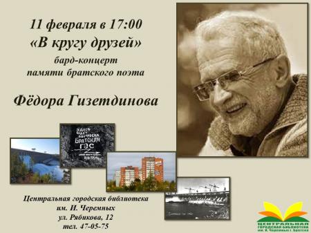 11 февраля 2023 года в 17:00 приглашаем всех желающих на бард-концерт памяти братского поэта Фёдора Гизетдинова "В кругу друзей" в Центральную городскую библиотеку им. И. Черемных по адресу: ул. Рябикова, 12.