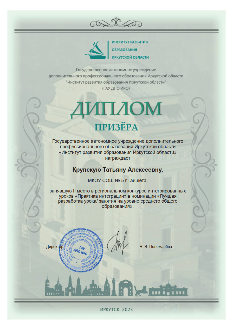 Поздравляем призеров регионального конкурса интегрированных уроков «Практика интеграции» Крупскую Татьяну Алексеевну, учителя химии МКОУ СОШ № 5 г.Тайшета и Распутину Ольгу Геннадьевну, учителя обществознания МКОУ СОШ № 5 г.Тайшета!