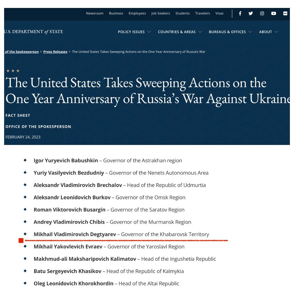 После опубликования санкционных списков Госдепартамента США, в которые вошли 40 российских губернаторов, губернатор Хабаровского края Михаил Дегтярёв стал абсолютным рекордсменом по количеству санкций.