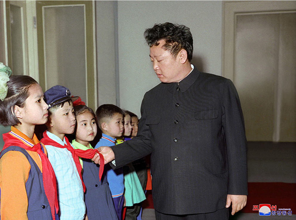 Великий руководитель товарищ Ким Чен Ир встречает с детьми и учениками, одетыми в подаренные одежды. Марта 66 года чучхе(1977)