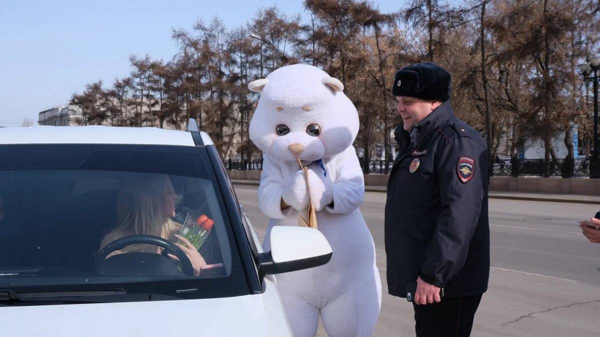 На центральной площади Иркутска 8 марта с Международным женским днём прекрасную половину человечества поздравлял большой плюшевый мишка. Его сопровождали сотрудники исполкома Иркутского регионального отделения «Единой России» и ГИБДД.
