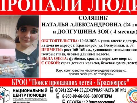 В Красноярске в четверг, 10 августа, ушла вместе с дочкой из дома по адресу улица Республики дом №39 и пропали 24-летняя женщина и ее четырехмесячная дочка.