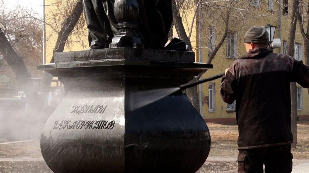 Фото мэрии ИркутскаДля устранения загрязнений применяются безопасные моющие средства и автоматическое оборудование для покраски. В работах задействованы 100 человек и специализированная техника.