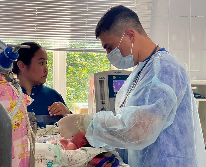 Опытные специалисты неонатальной бригады врач-анестезиолог-реаниматолог Денис Артемьев и медицинский брат-анастезист Вячеслав Мурашов подключили ребёнка к транспортному аппарату ИВЛ и переместили в воздушное судно. В полете медицинские работники контролировали состояние младенца, измеряли пульс, дыхание, сознание. Медицинскую эвакуацию маленький пациент перенёс хорошо.